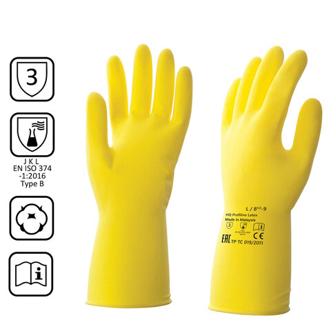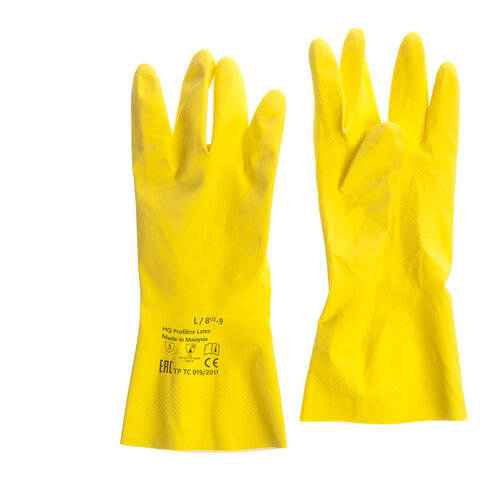 Перчатки латексные КЩС, сверхпрочные, плотные, хлопковое напыление, размер 8,5-9, L (большой), желтые, HQ Profiline, 73587