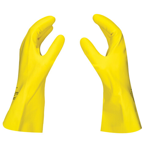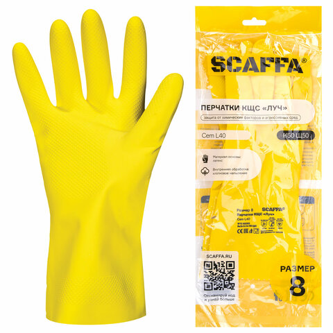 Латексные перчатки от химических воздействий SCAFFA "Луч" КЩС (растворов кислот концентрацией 50%, растворов щелочей концентрацией 50%) с хлопковым напылением, текстурированной рабочей поверхностью. Безопасны для контакта с пищевыми продуктами.