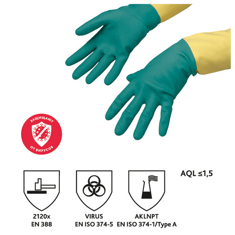 Перчатки VILEDA латекс-неопреновые МНОГОРАЗОВЫЕ х/б напыление СВЕРХПРОЧНЫЕ, размер M (средний), зеленые/желтые, 174305
