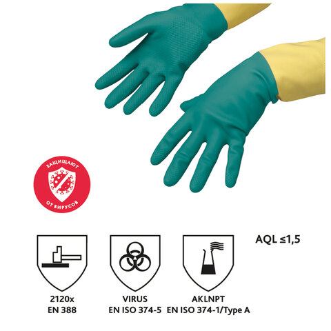 Перчатки VILEDA латекс-неопреновые МНОГОРАЗОВЫЕ х/б напыление, СВЕРХПРОЧНЫЕ, размер L (большой), зеленые/желтые, 174307