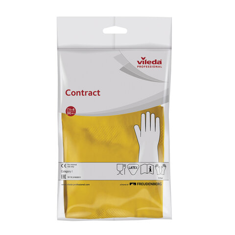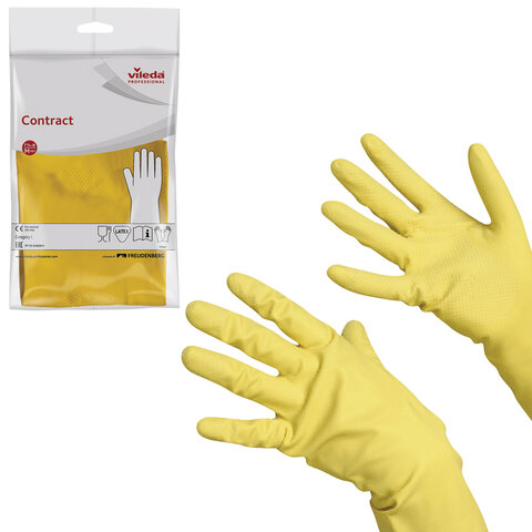 Прочные перчатки VILEDA "Контракт" для общей уборки из натурального латекса. Комфортные (внутри хлопковое покрытие), эластичные, долговечные. Повышенная чувствительность в области пальцев.