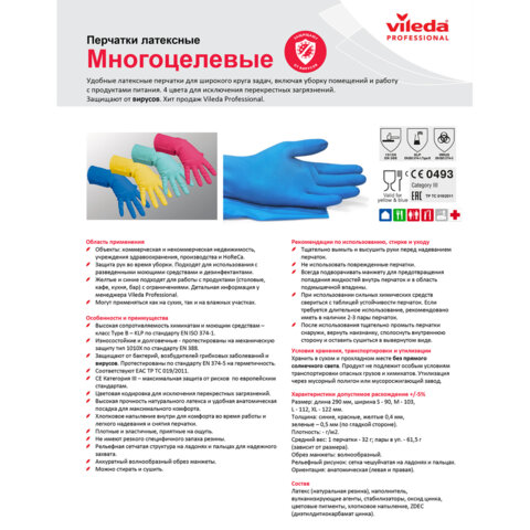 Удобные латексные перчатки VILEDA для широкого круга задач, включая уборку помещений и работу с продуктами питания. 4 цвета для исключения перекрестных загрязнений. Защищают от вирусов. Хит продаж VILEDA Professional.
