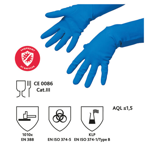 Перчатки VILEDA многоцелевые латексные МНОГОРАЗОВЫЕ х/б напыление, ПРОЧНЫЕ, M (средний), синие, 174353
