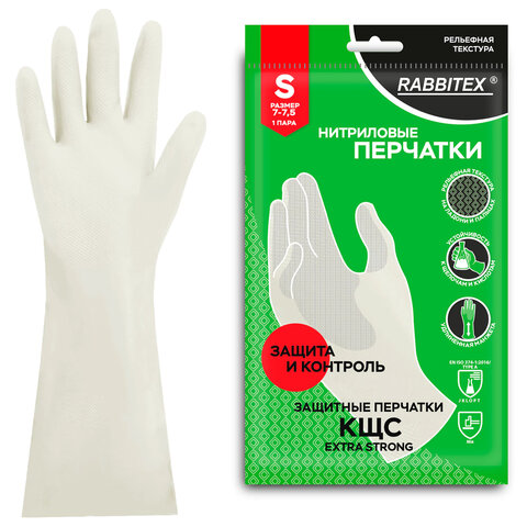 Перчатки нитриловые КЩС, EXTRA STRONG, химически устойчивые, белые, размер 7-7,5, S (малый), RABBITEX (РАББИТЕКС), 700914