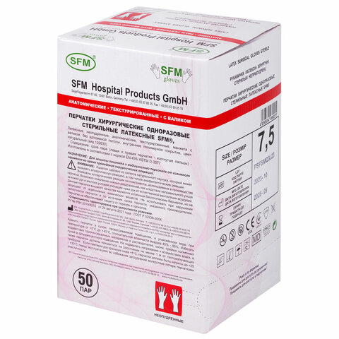 Перчатки латексные стерильные хирургические, КОМПЛЕКТ 50 пар (100 штук), Германия, размер 7,5, М (средний), SFM