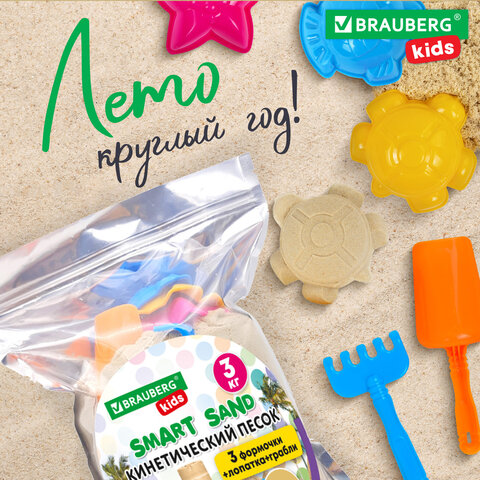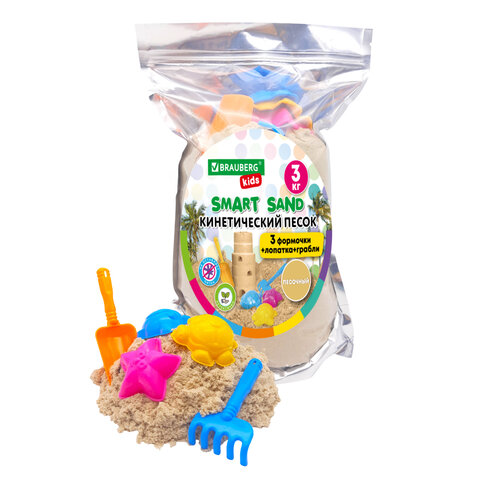 Песок для лепки кинетический, цвет песочный, 3000 г, 3 формочки, лопатка, грабли, BRAUBERG KIDS, 666004