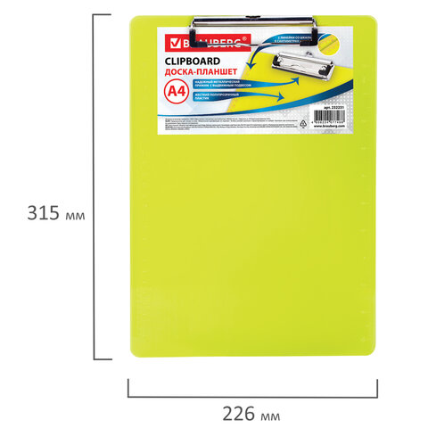 Доска-планшет BRAUBERG "Energy" с прижимом А4 (226х315 мм), пластик, 2 мм, неоновый, ЖЕЛТАЯ, 232231