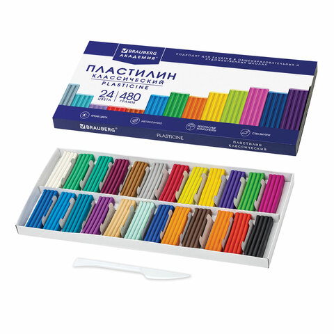 Пластилин классический BRAUBERG "АКАДЕМИЯ КЛАССИЧЕСКАЯ", 24 цвета, 480 г, СТЕК, ВЫСШЕЕ КАЧЕСТВО, 106424