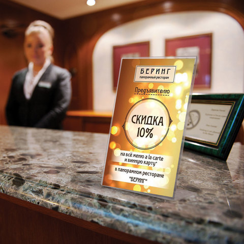 Односторонняя вертикальная настольная подставка BRAUBERG подходит для размещения меню, рекламных материалов формата А5.
