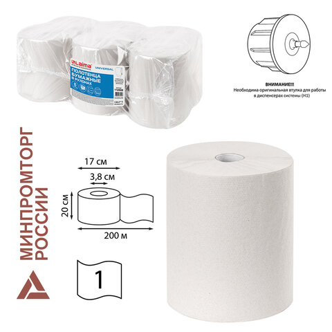 Бумажные полотенца в рулонах LAIMA UNIVERSAL подходят к диспенсерным системам H1 ПРИ ИСПОЛЬЗОВАНИИ ОРИГИНАЛЬНЫХ ВТУЛОК от расходных материалов H1.