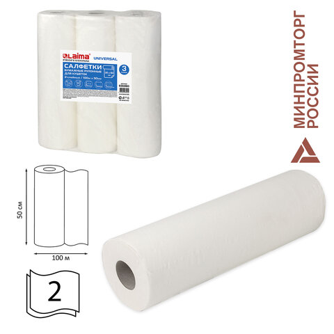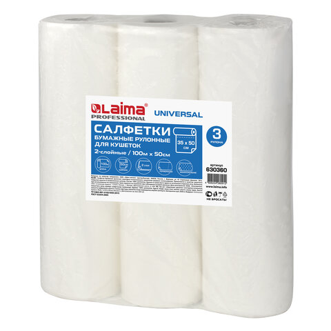 Простыни бумажные рулонные с перфорацией LAIMA UNIVERSAL КОМПЛЕКТ 3 шт., 2-слойные, 0,5х100 м, 17+17 г/м2, 630360, БС-2-ПР/100