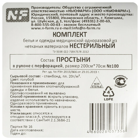 Простыня голубая рулонная с перфорацией 100 шт., 70х200 см, спанбонд 20 г/м2, NF