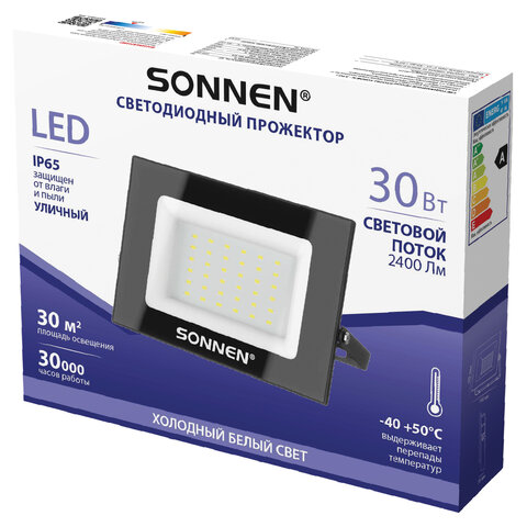 Прожектор светодиодный 30 Вт, 6500 К, 2400 Лм, 30 м2, IP65, 146x98x26 мм, черный, SONNEN, 238413
