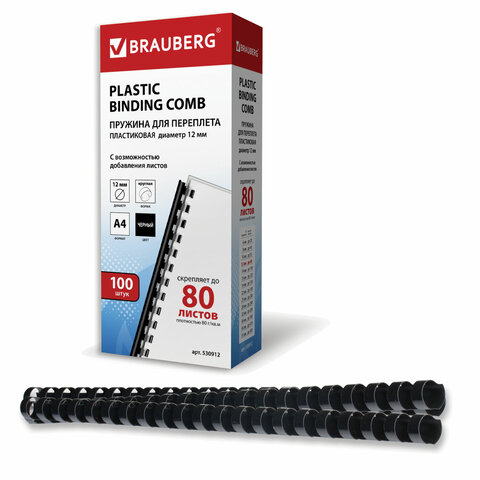 Пружины пластиковые для переплета, КОМПЛЕКТ 100 шт., 12 мм (для сшивания 56-80 л.), черные, BRAUBERG, 530912