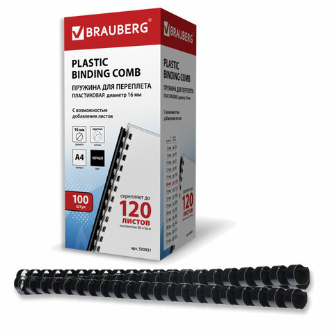 Пружины пластиковые для переплета, КОМПЛЕКТ 100 шт., 16 мм (для сшивания 101-120 л.), черные, BRAUBERG, 530921