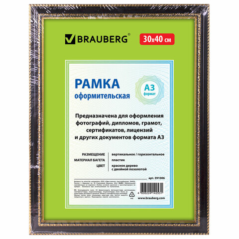 Рамка BRAUBERG "HIT4" для оформления фотографий, дипломов, сертификатов, грамот, лицензий и других документов формата А3 (30х40 см) будет гармонично смотреться в любом интерьере - дома и офисе, учебных учреждениях и магазинах, салонах и предприятий и др.