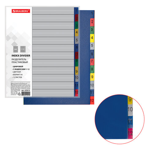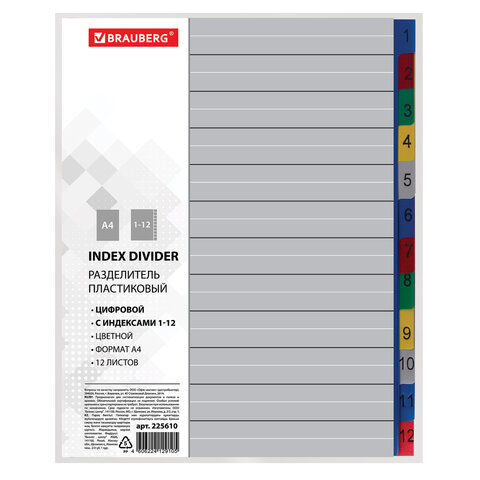 Разделитель пластиковый BRAUBERG, А4, 12 листов, цифровой 1-12, оглавление, цветной, РОССИЯ, 225610