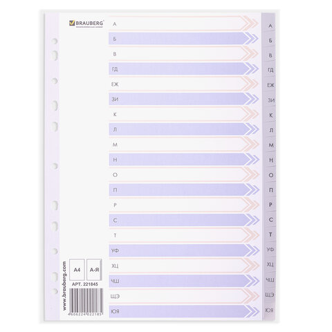 Разделитель пластиковый BRAUBERG, А4, 20 листов, алфавитный А-Я, оглавление, серый, Китай, 221845