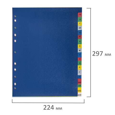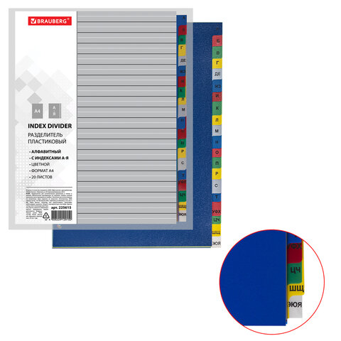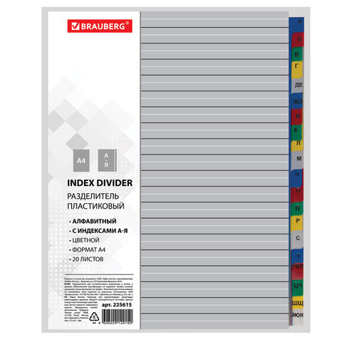 Разделитель пластиковый BRAUBERG, А4, 20 листов, алфавитный А-Я, оглавление, цветной, РОССИЯ, 225615