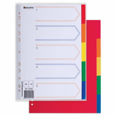 Разделитель пластиковый BRAUBERG, А4, 5 листов, по цветам, оглавление, Китай, 221846