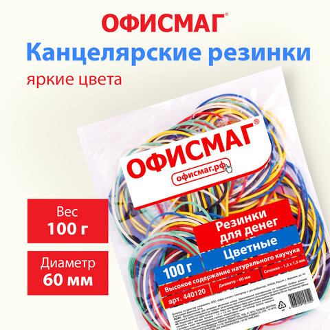 Резинки банковские универсальные диаметром 60 мм, ОФИСМАГ 100 г, цветные, натуральный каучук, 440120