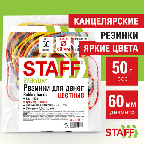 Резинки банковские универсальные диаметром 60 мм, STAFF 50 г, цветные, натуральный каучук, 440117
