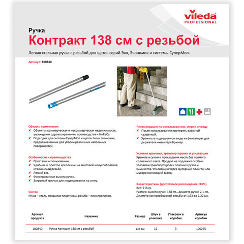 Черенок рукоятка для уборочного инвентаря 138 см, еврорезьба, металлопластик, VILEDA "Контракт", 100840
