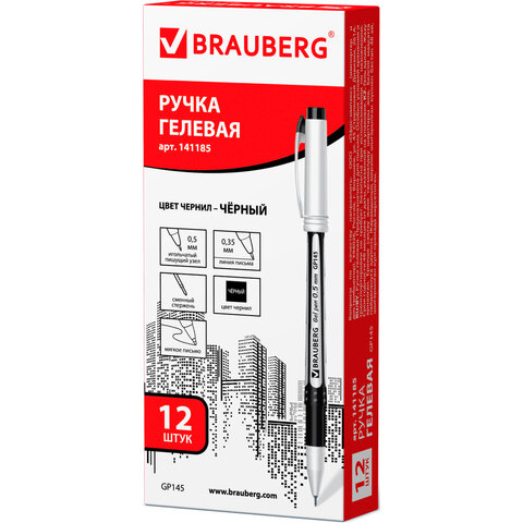 Ручка гелевая с грипом BRAUBERG "Contact", ЧЕРНАЯ, корпус черный, игольчатый узел 0,5 мм, линия письма 0,35 мм, 141185