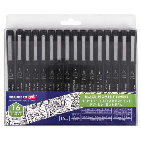 Капиллярные ручки линеры 16 шт. черные, 0,15-3,0 мм, BRAUBERG ART CLASSIC, 143946