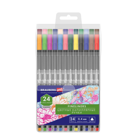 Ручки капиллярные (линеры), 24 ЦВЕТА, BRAUBERG ART "Classic", трехгранные, металлический наконечник, линия письма 0,4 мм, 144148