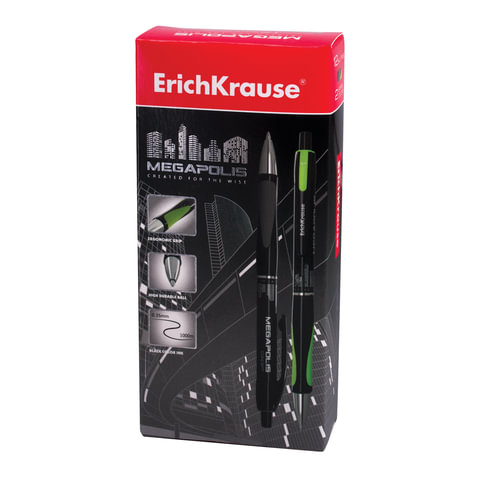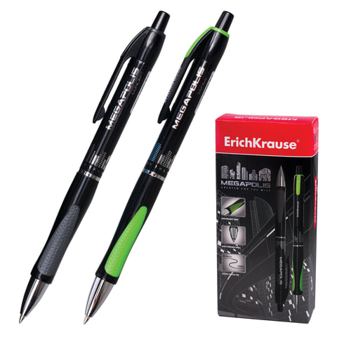 Стильная шариковая автоматическая ручка ERICH KRAUSE Megapolis Concept с металлизированным наконечником в круглом пластиковом черном корпусе.