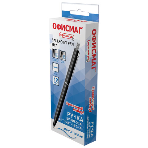 Ручка шариковая автоматическая ОФИСМАГ "M17", СИНЯЯ, корпус черный, стандартный узел 0,7 мм, линия письма 0,5 мм, 144159