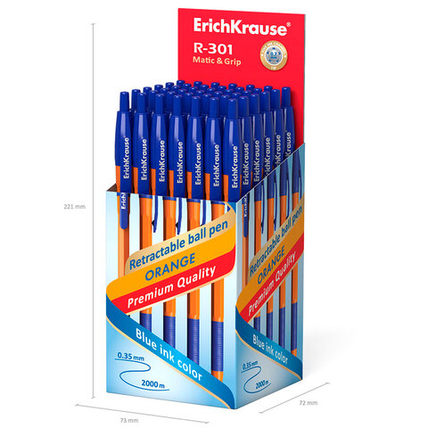 Ручка шариковая автоматическая с грипом ERICH KRAUSE "R-301 Orange", СИНЯЯ, узел 1,0 мм, линия письма 0,35 мм, 46762