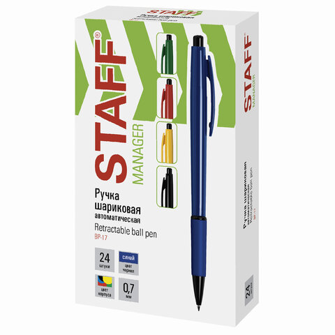Ручка шариковая автоматическая с грипом STAFF "Manager BP-17", СИНЯЯ, ассорти, линия письма 0,35 мм, 143751