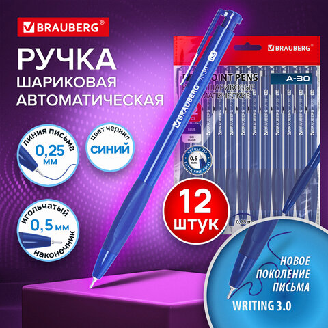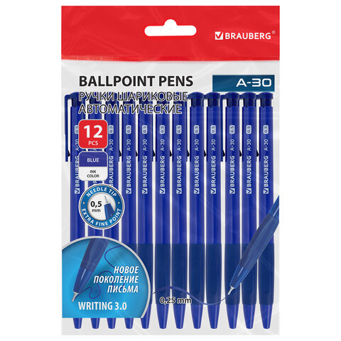 Ручки шариковые автоматические BRAUBERG A-30 "WRITING 3.0", КОМПЛЕКТ 12 ШТ, СИНИЕ, пишущий узел 0,5 мм, линия письма 0,25 мм, 144340