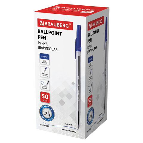 Ручка шариковая BRAUBERG "Line", СИНЯЯ, корпус прозрачный, узел 1 мм, линия письма 0,5 мм, 141097