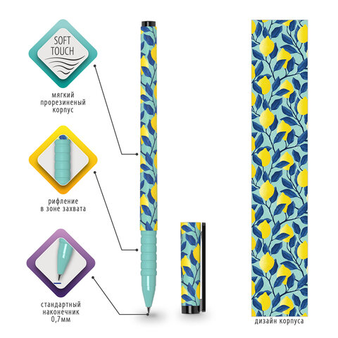 Ручка шариковая BRAUBERG SOFT TOUCH GRIP "CITRUS", СИНЯЯ, мягкое покрытие, узел 0,7 мм, 143717