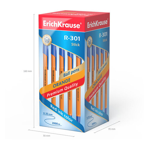 Ручка шариковая ERICH KRAUSE "R-301 Orange", СИНЯЯ, корпус оранжевый, узел 0,7 мм, линия письма 0,35 мм, 43194
