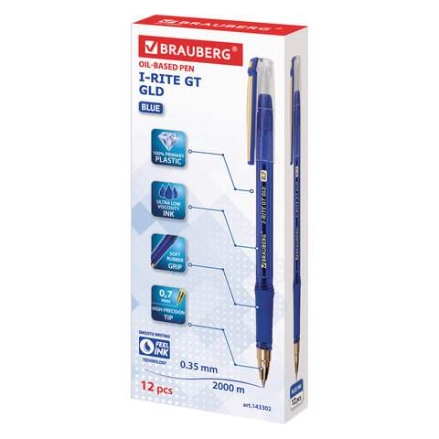 Ручка шариковая масляная с грипом BRAUBERG "i-Rite GT GLD", СИНЯЯ, корпус тонированный синий, узел 0,7 мм, 143302