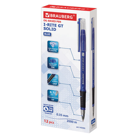 Ручка шариковая масляная с грипом BRAUBERG "i-Rite GT Solid", СИНЯЯ, корпус синий, узел 0,7 мм, 143305