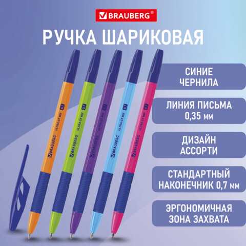 Ручка шариковая с грипом BRAUBERG "ULTRA GT COLOR", СИНЯЯ, корпус ассорти, линия 0,35 мм, 144055