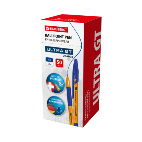Ручка шариковая с грипом BRAUBERG "ULTRA GT ORANGE", СИНЯЯ, корпус оранжевый, линия 0,35 мм, 144052