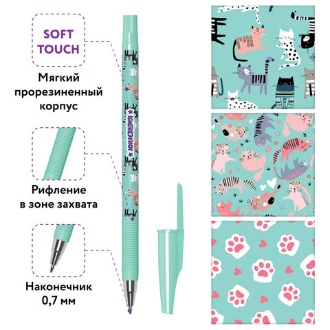 Ручка шариковая ЮНЛАНДИЯ "GLAMOUR CAT", синяя, SOFT TOUCH покрытие, узел 0,7 мм, линия письма 0,35 мм, 143734