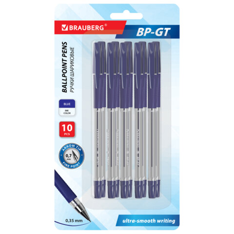 Ручки шариковые BRAUBERG "BP-GT", НАБОР 10 ШТУК, СИНИЕ, евронаконечник 0,7 мм, линия письма 0,35 мм, блистер, 144008
