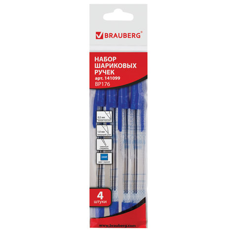 Ручки шариковые BRAUBERG, НАБОР 4 шт., СИНИЕ, "Line", узел 1 мм, линия письма 0,5 мм, 141099