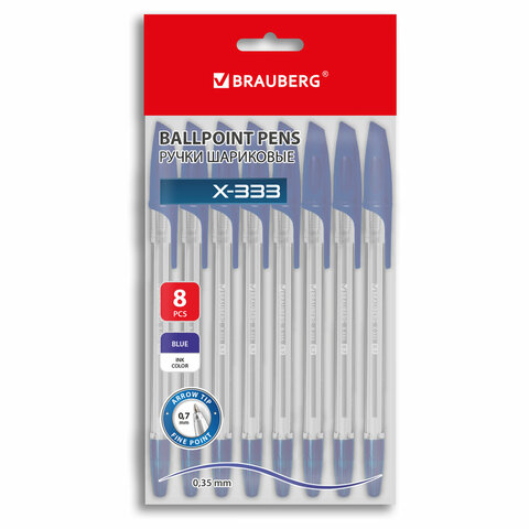 Ручки шариковые BRAUBERG "X-333", НАБОР 8 ШТУК, СИНИЕ, узел 0,7 мм, линия письма 0,35 мм, 144527