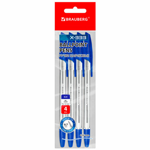 Ручки шариковые BRAUBERG "X-333", СИНИЕ, НАБОР 4 шт., узел 0,7 мм, линия 0,35 мм, 144253