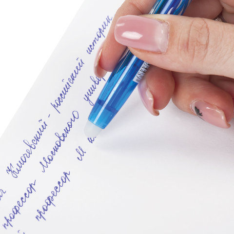 Стираемая ручка BRAUBERG пишет специальными гелевыми чернилами, которые становятся невидимыми при нагревании до 60 °С и выше. Нагрев достигается ластиком, встроенным в корпус ручки. Написанное можно восстановить при температуре ниже –18 °С.