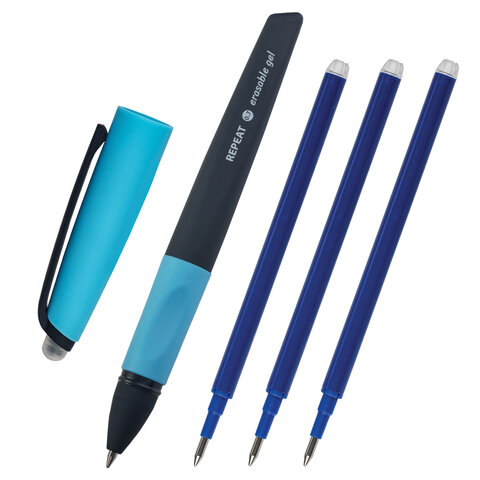 Ручка стираемая гелевая с эргономичным грипом BRAUBERG REPEAT, СИНЯЯ, +3 сменных стержня, узел 0,7 мм, линия письма 0,5 мм, 143663