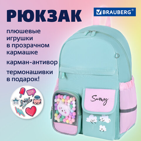 Рюкзак BRAUBERG PASTEL с термонашивками в комплекте, "Funny clouds", мятный, 40х29х14 см, 271421